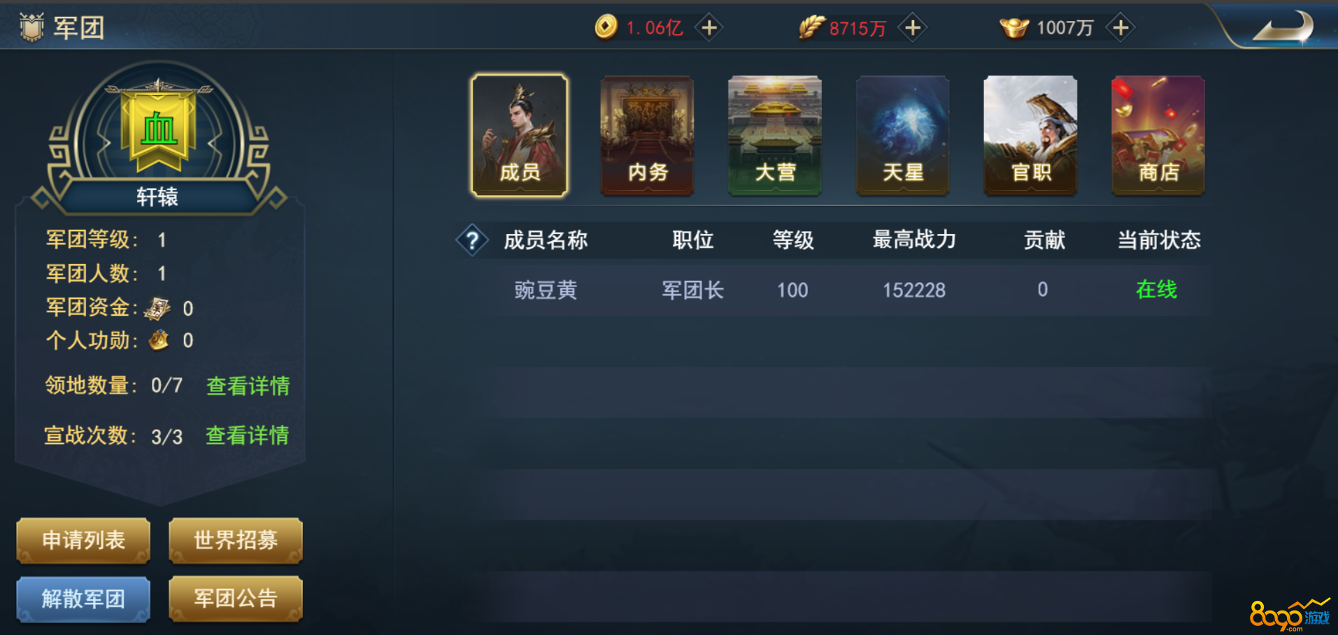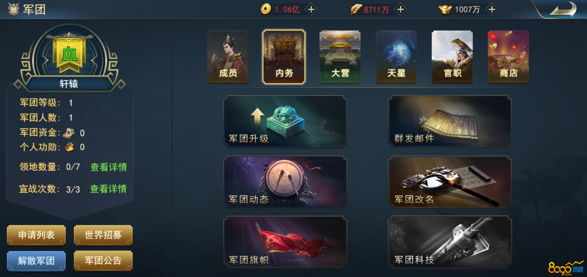 军团内成员可以将部队派遣到军团大营中,军团长及副团长可以在城战时调遣大营中的部队自动参战