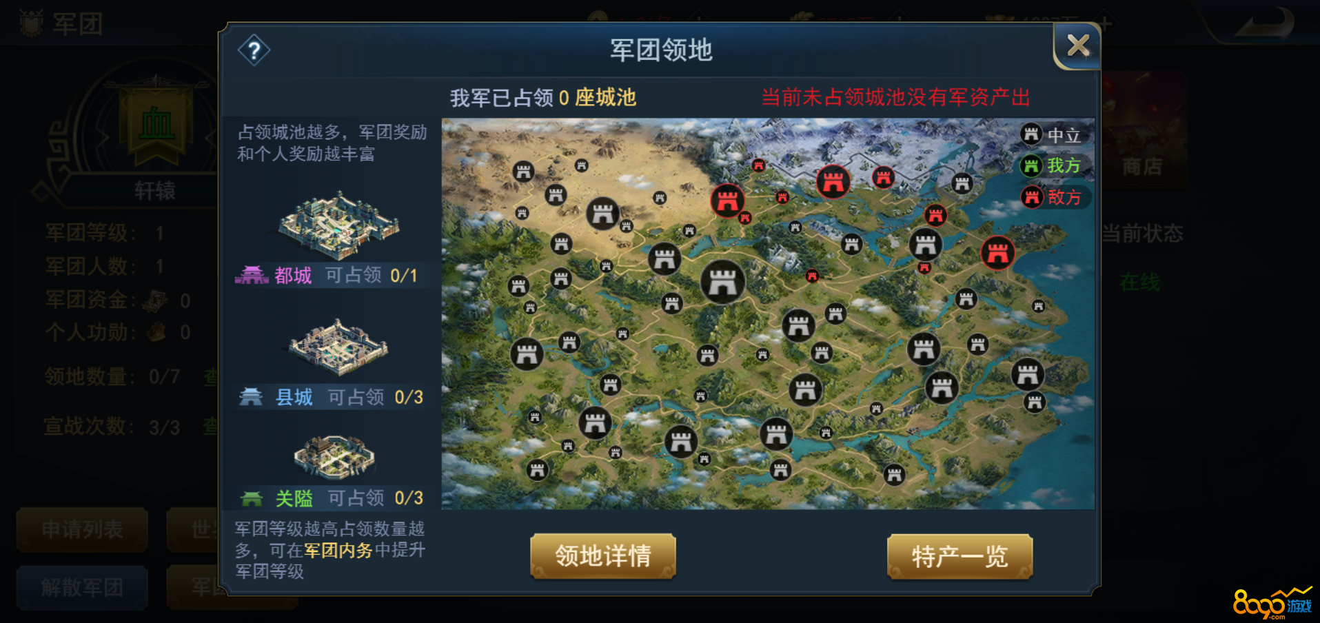 加入军团之后,攻陷其他城池且满足占领条件时,该城池将成为本军团领地。领地城池可产出铜钱及功勋资源,在领地功能中可查看领取领地奖励。