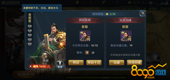 17级开放切磋拜访系统,在名将列传上寻找到居住着武将战役,即可在战役菜单中点击该武将头像进行切磋与拜访。