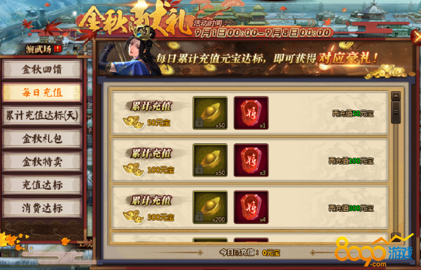 l 当日充值满500元宝,可额外领取一次已选奖励。