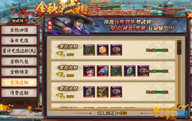 活动开启时间:2019年9月1日--2019年9月7日,持续时间为7天(新服7天后可见)全新上线 神将朱然