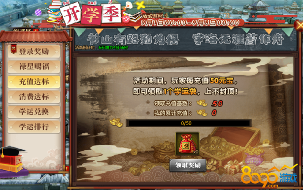 l 活动期间,每充值50元宝获得1个学运袋,上不封顶;