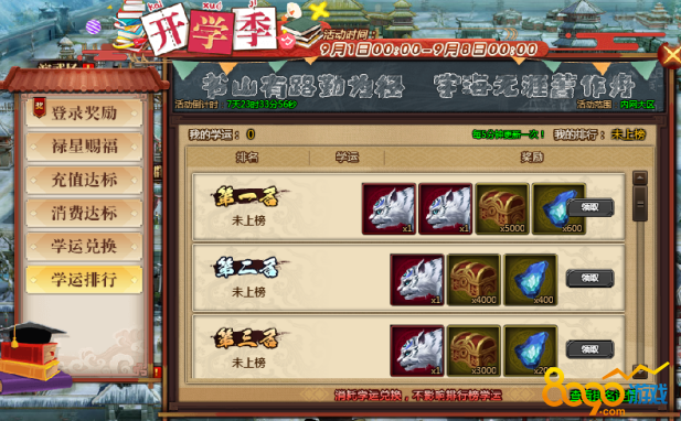 l 活动期间累积时运进行排行,可获得专属称号及丰富道具奖励,学运越多,排名越高,截止9月7日0:00后可领取奖励;