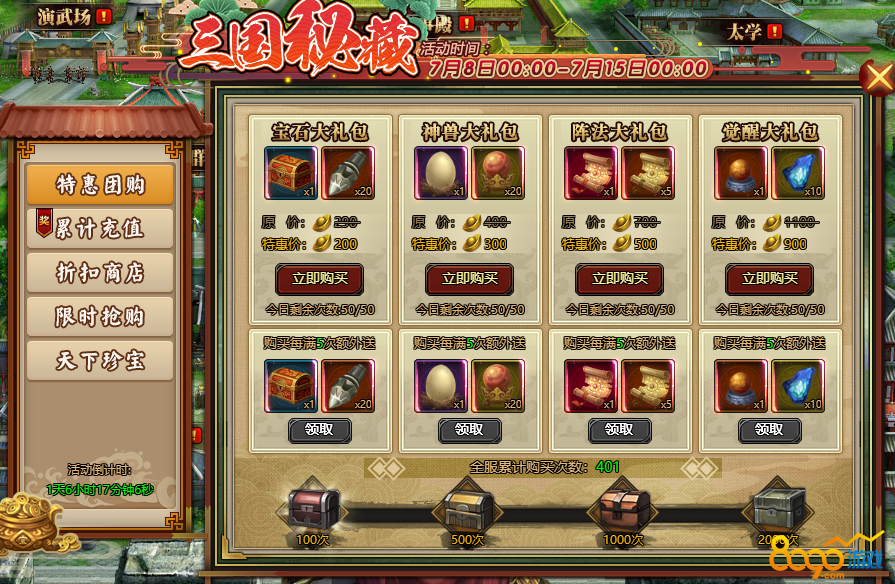 l 可折扣购买大礼包,每买5次额外赠送一个大礼包;