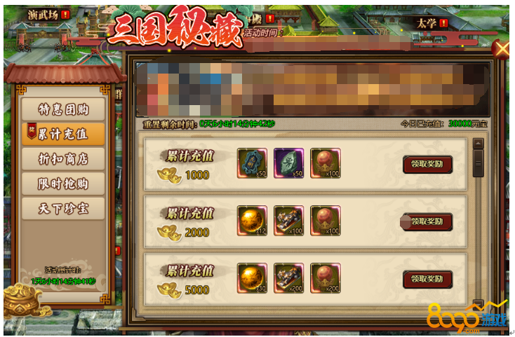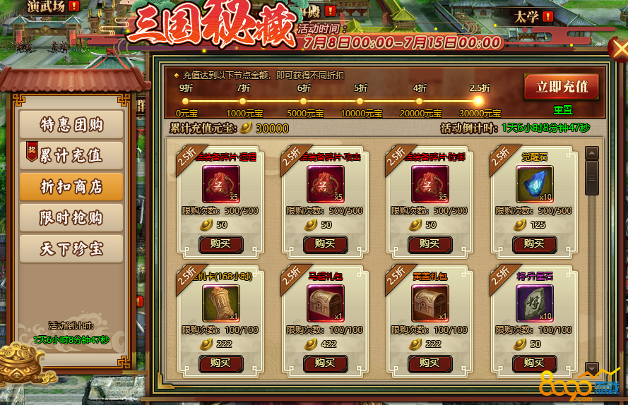 l 充值金额达标可获得相应道具购买折扣,充值越多,折扣越低。