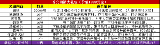 首次充值“任意金额”,即可免费领取价值1888元宝首次充值回馈礼包,哪怕仅仅是1元钱!