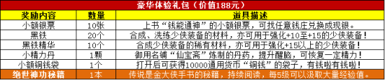 礼包内所有物品均为绑定不可交易,且每个角色只能使用1张888元大侠黄金卡;