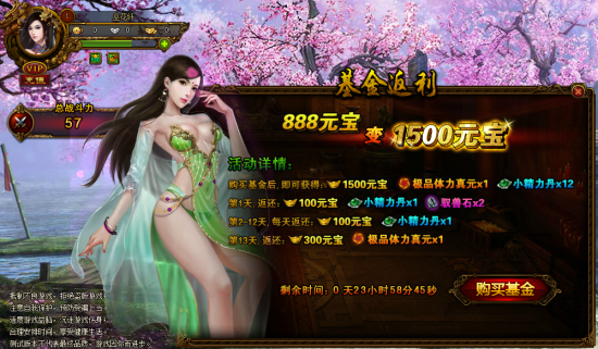 活动截止前(开服第5日23:59前),可消耗888元宝参与“基金返利限时回馈活动”购买基金,