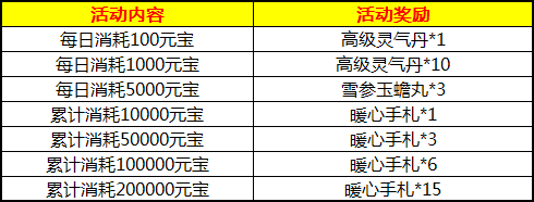 1. 活动期间,待元宝消耗达到指定目标到即可前往精彩活动面板内领取奖励。