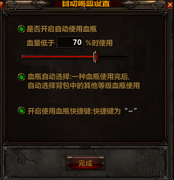 在设置自动回血的按钮旁边,有个血瓶的图标。这个血瓶的图标表示为自动回血设置的血瓶,背包里有的血瓶,会自动在这里显示,按照血瓶使用等级由高到底排列。自动回血时优先使用使用等级高的血瓶。