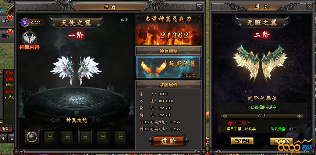 8090《冰火之刃》玩家达到对应等级自动开启翅膀功能,点击 神翼 打开界面。