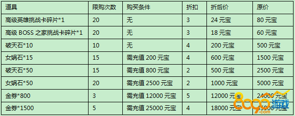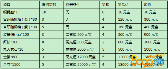 活动规则:活动期间,折扣商城开启,商城内可购买到超值价格的道具哦~