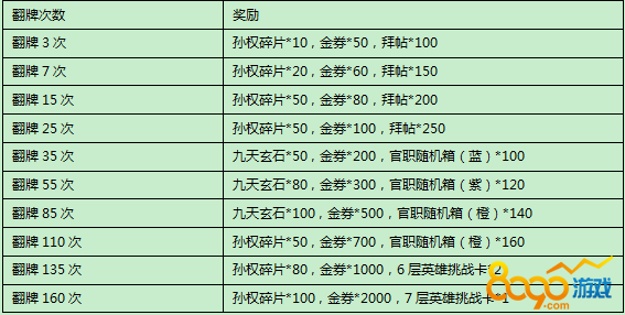 活动规则:活动期间,玩家翻牌有几率获得奖励,且次翻牌次数越高,累计的次数奖励越丰富。