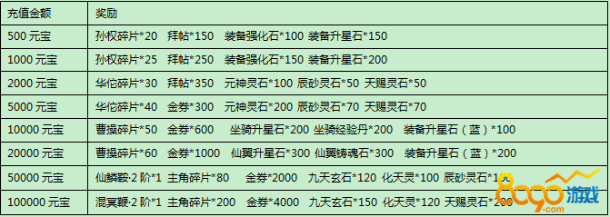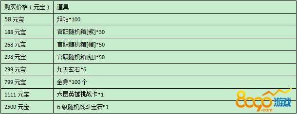 活动规则:活动期间,充值达1000、2000、3000、5000元宝,每个充值档次都可以重置一次以下物品的购买资格。