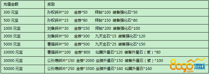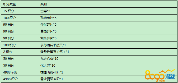 活动规则:活动期间,每充值10元宝即可获得1点积分,积分可用于兑换以下道具。