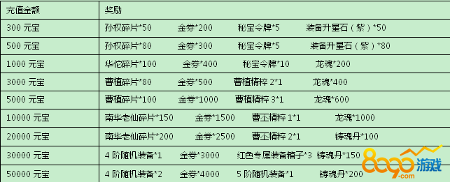第二天充值达12800元宝:金券*1500 南华老仙碎片*250 5级智力宝石*1 龙魂*3000