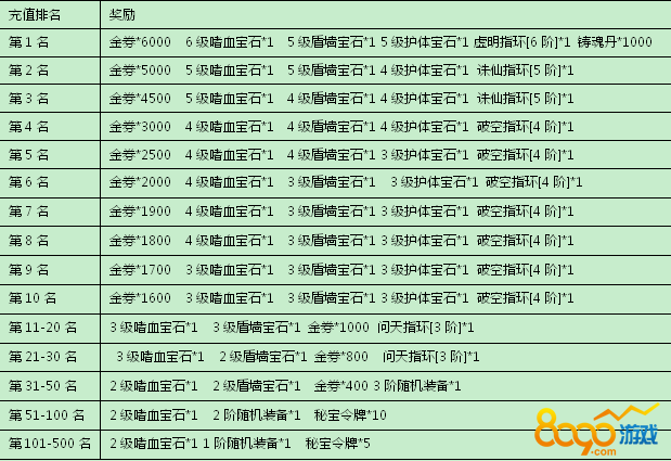 活动规则:活动期间,开启跨服充值排行榜,玩家充值名次越高,获得的奖励越高。