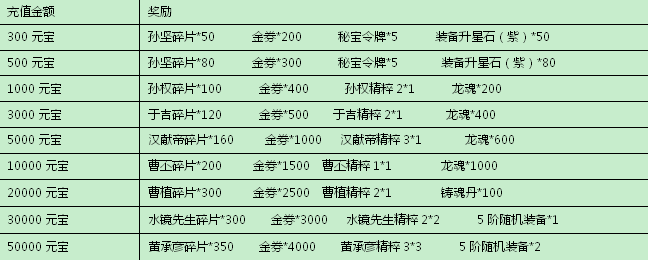 第三天充值达12800元宝:金券*1500 4级嗜血宝石*2 5级武力宝石*1 龙魂*3000