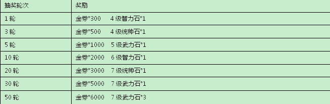 活动规则:活动期间,玩家每充值200元宝可获得抽奖券*1,抽奖券可在此活动中进行抽奖,且抽奖轮次越多,可领取奖励越多。