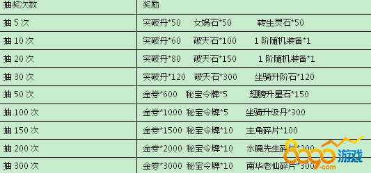 活动规则:活动期间,玩家每充值300元宝可抽奖一次,累计抽奖达到一定次数,可领取相应奖励。