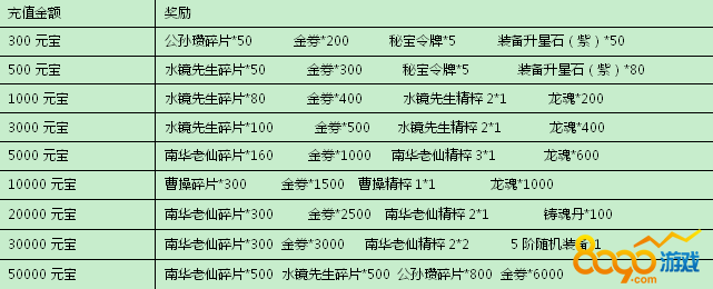 活动规则:活动期间,每日充值达12800元宝即可以下领取豪华奖励,每天奖励都有所不同。