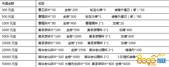 第三天充值达12800元宝:金券*1500 水镜先生碎片*300 5级武力宝石*1 水镜先生精粹3*2