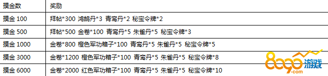 活动规则:活动期间,每日充值达12800元宝即可以下领取豪华奖励,每天奖励都有所不同。