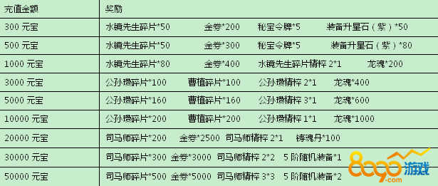 活动规则:活动期间,每日充值达2000元宝即可以下领取豪华奖励,活动每日进行重置。