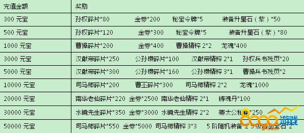 第一天充值达13800元宝:金券*1500 翅膀升星石*500 青鸾丹*20 水镜先生碎片*300 无双财神称号*1