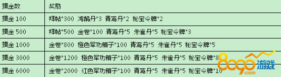 活动规则:活动期间,每日充值达12800元宝即可以下领取豪华奖励,每天奖励都有所不同。