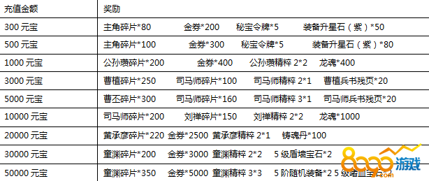 第一天充值达13800元宝:金券*1500 秘宝令牌*100 龙魂*2000 司马师碎片*250 6级武力宝石*1 3阶随机装备*1