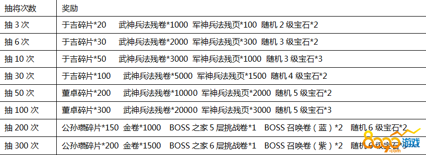 活动规则:活动期间,打BOSS有几率掉落抽将卡碎片,收集抽将卡碎片可用于合成完整抽将卡。也可消耗200元宝来进行一次抽将,抽将次数越高,可领取的排名奖励越高。