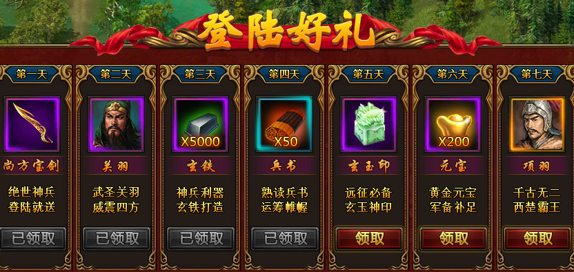 【活动内容】:每天登录有超豪华战力大礼,尚方宝剑、关羽紫卡、项羽橙卡,还有各种给力道具,每天登录稳步提升战力!