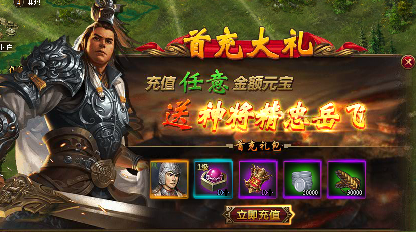 【活动内容】:首次充值任意金额,即可获得价值6888元宝的首充道具奖励!首次充值即可获得岳飞*1,一级升星丹*10 征兵令*10 银币*50000,粮食*30000,绝对值得拥有!