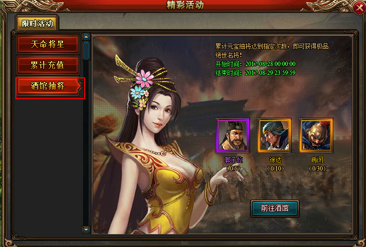 【领取方式】:点击“精彩活动“——“酒馆抽将”图标进行领取