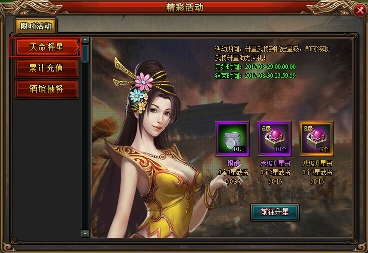 【领取方式】:点击“精彩活动“——“天命将星”图标进行领取