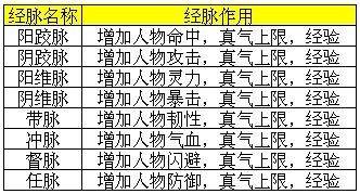 其中每级增加的属性值和真气上限为固定值,经验随经脉的等级提升相应的增加。经脉总共有20级。玩家把所有经脉全部升级到20级之后,就相当于打通任督二脉,达到武学上的巅峰。