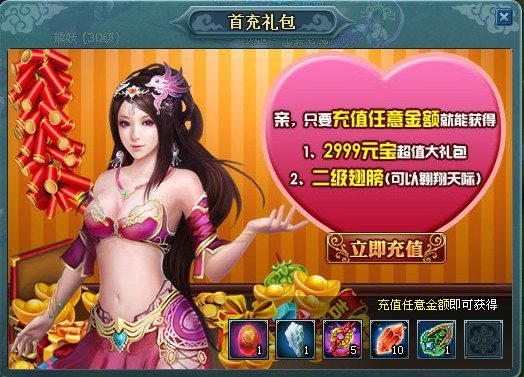 首充礼包:这个礼包的内容比之新手礼包以及活动礼包,一般是要好上很多的,而达成领取这个礼包的条件自然就是需要我们进行充值了。首充的定义我想大家都清楚,就是指第一次充值,对于充值的金额是没有限制的,所以我们只要在这个游戏里进行了充值,就可以直接领取这个首冲礼包了。充值的操作,我们在游戏中点击“福”字对面的“充”字就会进入充值的网页界面了。