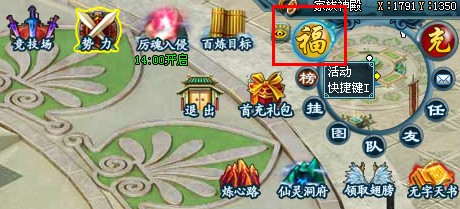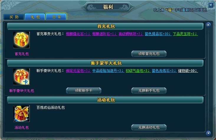 在图上我们可以看到这三种礼包的大致介绍,以及领取和兑换按钮。进入这个福利礼包面板,我们在游戏主界面右上角位置点击“福”字图标按钮,就可以弹出这个面板进行相关信息查看以及功能操作了。