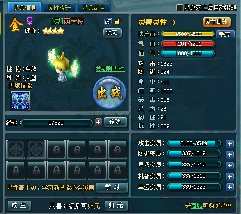 萌天使”,战斗中为主人带来更高的生存能力,初始资质相当高。“萌天使”攻击时候有概率为主人带来祝福效果,每秒恢复主人气血,持续8秒(恢复效果跟灵兽自身气血上限有关,气血上限越高恢复量越高)。