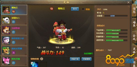 成长培养:通过消耗成长丹可以提升宠物的属性,每只宠物限制使用50次成长丹。