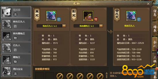 新宠物的成长和资质,在不同品阶的宠物合成时,将继承主宠与副宠中最高的(同品阶则将在主宠和副宠之间随机继承)。合宠后副宠的技能将有一定概率附加在主宠上。