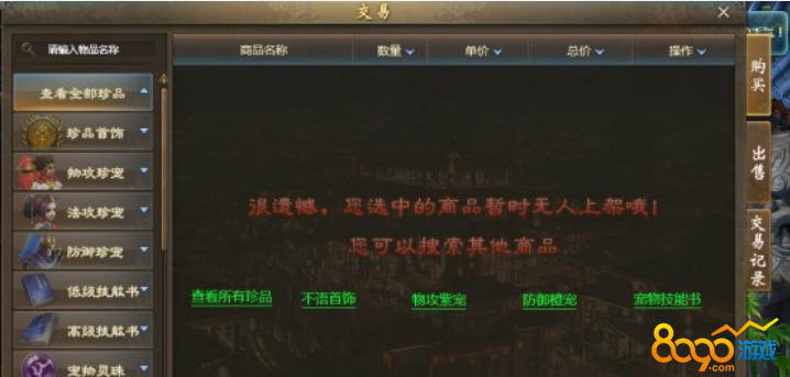 搜索"8090网页游戏"点击右上角摆摊图标打开摆摊交易系统.玩家可在交易中出售或购买所需的物品,在交易中使用的货币是银两,银两无法兑换成元宝。可交易的物品有:首饰、珍宠、技能书、宠物灵珠、宠物经验丹、五宝(兑换高级藏宝图的道具)、药品、烹饪食物、首饰打造书、首饰打造道具等等.