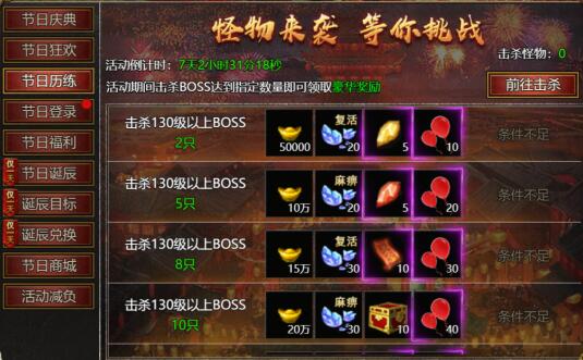 【活动内容】:活动期间,击杀怪物达到指定数量,领取奖励!