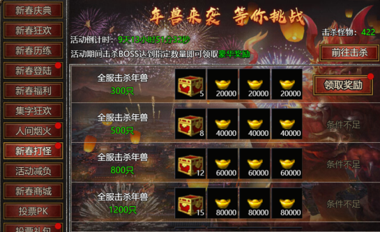 【活动内容】:活动期间,全服击杀指定年兽数量可领取豪华奖励!