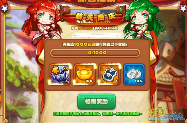 1.当日累计充值元宝数达到所需额度,即可领取对应奖励!每日赠送不同国家的武将碎片,元宝,神秘令和铜钱哦!