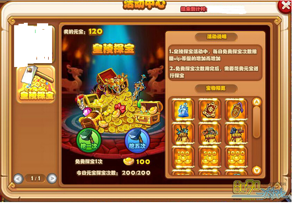 活动说明:玩家点击活动中心(主城左下角)里的皇陵探宝,进行挖宝。丰厚奖励等待你来探索。