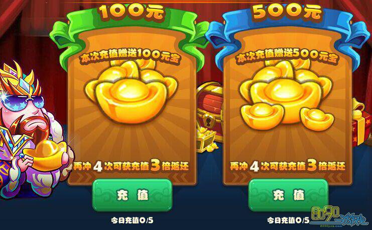 3.该活动前四次充值(需要分次充值,不能一次选择5个100或5个500哦),每次都会返还玩家充值的10%元宝,当充值到第五次时,会获得100元或500元额度的三倍充值返利