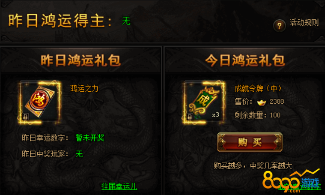 活动期间,购买限购礼包赢取幸运大奖,奖励极品限时称号。(全服限量买到即赚到)购买礼包越多,中奖几率越大!
