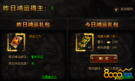 活动期间,购买限购礼包赢取幸运大奖,奖励极品限时称号。(全服限量买到即赚到)购买礼包越多,中奖几率越大!